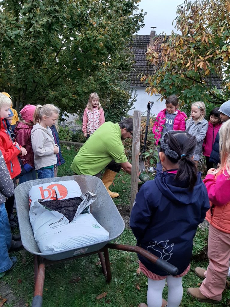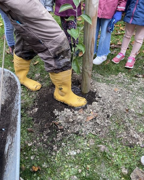 Am 31.10. 2023 haben wir zwei Apfelbäume und eine Quitte als Follow-up zur Veredelungsstunde im September gepflanzt. Die Kinder durften kräftig mit anpacken und so waren die drei Bäume dann auch ruck-zuck in der Erde verschwunden.
